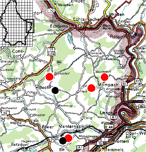 Insgesamt konnten 1995 in Ost-Luxemburg vier erfolgreiche Rotmilanbruten und zwei erfolgreiche Schwarzmilanbruten festgestellt werden. Von den Vorjahreshorsten wurden bei den Rotmilan drei, bei den Schwarzmilanen einer wiederbenutzt. Die neuen Horste befanden sich durchweg in der Nähe der alten. In einem der drei Fälle war bei den Rotmilanbruten ein Wechsel des Horstes auch mit einem Wechsel der Horstbaumart verbunden (Manternach, von Buche zu Eiche). Beim Schwarzmilan blieb die Eiche auch weiterhin der bevorzugte Horstbaum. Der Brutbeginn schien 1995 sowohl beim Rotmilan wie beim Schwarzmilan homogener zu sein als im letzten Jahr. Die Rotmilane begannen wohl alle in der Aprilwoche zwischen dem 10. und 16.4. mit der Brut; die Schwarzmilane begannen mit ihrer Brut offensichtlich eine Woche später (17. bis 23.4.). Weniger breit war auch die Spannweite in der Anzahl der flügge geworden Milane. Bei den Rotmilanen kamen in jedem Horst 2 Junge zum Ausfliegen; im Falle der Schwarzmilane waren es in einem Fall 2 Jungvögel (Vorjahr 1) und im anderen Fall 1 Jungvogel (Vorjahr 3). Die begonnene 1994er Brut des Brutpaares bei Rosport, die (wahrscheinlich durch das Ausschießen des Horstes) im Anfangsstadium abrupt beendet wurde, scheint die letzte gewesen zu sein. Im Jahr 1995 konnte (zumindest in dem gleichen Waldkomplex) keine Rotmilanbrut mehr registriert werden.