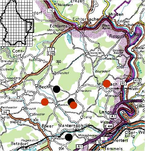 Für das Jahr 2000 kann von 2 erfolgreichen Rotmilanbruten (1999 2) und 3 erfolgreichen Schwarzmilanbruten (1998 2) ausgegangen werden. An Revierpaaren konnte zusätzlich, wie bereits im Vorjahr, bei Lellig ein Rotmilanpaar festgestellt werden, das im Gegensatz zum letzten Jahr mit großer Wahrscheinlichkeit auch zur Brut schritt, aber offensichtlich keinen Bruterfolg hatte. Bemerkenswert ist, dass im Untersuchungsgebiet eine zusätzliche Schwarzmilanbrut registriert werden konnte, so dass mehr erfolgreiche Schwarzmilan- als Rotmilanbruten registriert werden konnten. Der Bruterfolg bei Rotmilanen und Schwarzmilanen war, bezogen auf die Brutpaare, recht unterschiedlich. Während bei den Schwarzmilanen auf die 3 Brutpaare nur 4 flügge Junge kamen, wurden bei den 2 Rotmilanpaaren 5 Junge flügge. Von den Vorjahreshorsten wurden bei den Rotmilanen beide, bei den Schwarzmilanen ebenfalls zwei Horste wiederbenutzt. Das neue Schwarzmilanpaar bei Manternach siedelte sich in ca. 250 m Entfernung von dem angestammten Schwarzmilanpaar an. Die alten Rotmilanreviere bei Manternach (nach Revierbesetzung 1998 verlassen), Mompach (Totalverlust durch Abschuß 1996) und Rosport (Brutaufgabe 1997) blieben auch im Jahre 2000 verwaist. Bei den Rotmilanbruten war die Eiche wie 1999, entgegen dem Trend der letzten Jahre, wieder bevorzugter Horstbaum. Bei Berbourg und bei Givenich waren es jeweils der eigenen Vorjahreshorst. Beim Schwarzmilan blieb die Eiche weiterhin wie in den vergangenen Jahren der bevorzugte Horstbaum. Der Brutbeginn bei den Rotmilanen lag 2000 Mitte April (um den 12.4.). Die beiden Schwarzmilanpaare begannen mit ihrer Brut in diesem Jahr im letzten Aprildrittel (ca. 16.4.). Bei den beiden erfolgreichen Rotmilanenpaaren wurden insgesamt 5 Junge flügge (3 Berbourg und 2 Givenich). Der Zeitpunkt des Flüggewerdens lag Anfang Juli. Bei den beiden erfolgreichen Schwarzmilanenpaaren wurden insgesamt ebenfalls 4 Junge flügge (2 Berbourg und jeweils 1 in den beiden Horsten bei Manternach). Der Zeitpunkt des Flüggewerdens lag in der 1 Juli-Woche.