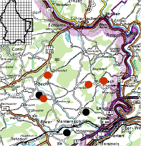 Im Untersuchungsgebiet konnten im Jahr 2002 vier Rotmilan- und drei Schwarzmilanrevierpaare festgestellt werden. Von den 4 Rotmilanpaaren schritten nur 3 zur Brut. Von den 3 Schwarzmilanpaaren waren es 2 Paare, die mit der Brut begannen. Von den 3 Rotmilanbruten verliefen aber nur 2 erfolgreich (2001 = 2). Von den 2 Schwarzmilanbruten war keine erfolgreich (2001 = 1). Bei den erfolgreichen Rotmilanbruten wurden insgesamt nur 3 Jungvögel flügge ( 1 und 2). Die beiden erfolgreichen Rotmilanpaaren benutzten wieder die Vorjahreshorste. Das dritte (nicht erfolgreiche) Rotmilanbrutpaar bezog eines der Vorjahreshorstbereiche. Das vierte Rotmilanrevierpaar besetzte zumindest vorübergehen ebenfalls eine ehemaliges Rotmilanbrutrevier (Balzflüge über dem Horstbereich, Horst selbst existiert nicht mehr). Das Schwarzmilanbrutpaar bei Berbourg benutzte offenbar wieder den Vorjahreshorst. Das Brutpaar bei Manternach bezog wieder das alter Revier und nutzte zwar nicht den Vorjahreshorst, aber einen Horst aus einem der Vorjahre. Das Revierpaar bei Lellig schritt offensichtlich nicht zur Brut und war auch nach kurzer Zeit nicht mehr im Revier anzutreffen. Bei den Rotmilanbruten war die Eiche wieder der bevorzugter Horstbaum. Bei Berbourg und bei Givenich waren es jeweils der eigenen Vorjahreshorst. Beim Schwarzmilan blieb die Eiche weiterhin wie in den vergangenen Jahren der bevorzugte Horstbaum. Der Brutbeginn bei den Rotmilanen lag 2002 in der dritten Aprilwoche. Bei den beiden erfolgreichen Rotmilanenpaaren wurden insgesamt 3 Junge flügge (1 Berbourg und 2 Givenich). Der Zeitpunkt des Flüggewerdens lag Anfang Juli.