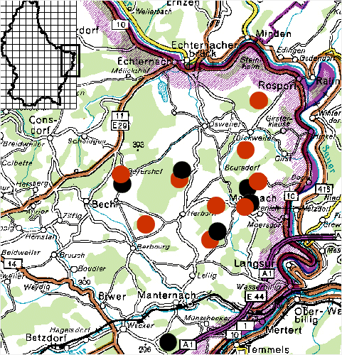 Im (engeren) Untersuchungsgebiet konnten im Jahr 2011 neun (2010: 8) Rotmilan- und sechs (2010: 8) Schwarzmilanreviere festgestellt werden. Von den 9 Rotmilanpaaren schritten alle 9 zur Brut. Von den 6 Schwarzmilanpaaren schritten 5 zur Brut. Von den 9 Rotmilanbruten verliefen alle erfolgreich. Von den 5 Schwarzmilanbruten waren alle erfolgreich. Von den neun erfolgreichen Rotmilanpaaren benutzten fünf jeweils denselben Horst wie im Vorjahr (Berbourg, Givenich, Dickweiler, Osweiler, Rosport). Von den fünf erfolgreichen Schwarzmilanpaaren benutzen vier die Vorjahreshorste. Bei den Rotmilanbruten war die Buche der bevorzugte Horstbaum. Die Schwarzmilane bevorzugten weiterhin die Eiche als Horstbaum. Der Brutbeginn bei den Rotmilanen lag 2011 vermutlich in der ersten bzw. zu Beginn der zweiten Aprilwoche. Der Brutbeginn der Schwarzmilanpaare lag vermutlich in der Regel in der zweiten Aprilwoche. Bei den 9 erfolgreichen Rotmilanbruten wurden mindestens 16 Jungvögel flügge (1 x 3, 5 x 2 und 3 x 1). Bei den 6 erfolgreichen Schwarzmilanbruten wurden mindestens 6 Jungvögel flügge (1 x 2 und 5 x 1).