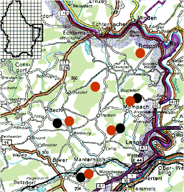 Bereits im Februar konnten die ersten Rotmilanbeobachtungen gemacht werden (17.2.24 (Mompach),19.2.24 (Rosport), 24.2.24 (Givenich)). Es folgten Anfang März die übrigen Revierbesetzungen (Berbourg 16.3.24, Manternach 16.3.24). Die erste Schwarzmilanbeobachtung erfolgte 2024 am 19.3.24 (Mompach). Schwarzmilanreviervögel wurden am 30.03.24 registriert (Lellig, Manternach). Die übrigen Revierbesetzungen erfolgten in der ersten und zweiten Aprilwoche (insgesamt 1-2 Wochen früher als 2023). Im Untersuchungsgebiet konnten im Jahr 2024 sechs (2023, 2022 und 2021 waren es auch 6) Rotmilanreviere- und fünf (2023 und 2022 waren es 5, 2021 waren es sogar 6) Schwarzmilanreviere kartiert werden. Über Anzahl der Bruten und Bruterfolg konnten für 2024 keine Aussagen getroffen werden. Von den Rotmilanpaaren benutzten nach Stand der Beobachtungen fünf von sechs die Vorjahreshorste (alle außer Berbourg). Von den Schwarzmilanpaaren benutzten drei von vier die Horste des Vorjahres. Bei den Rotmilanbruten war 2024 die Buche wieder der bevorzugte Horstbaum. Die Schwarzmilane bevorzugten so weit bekannt weiterhin die Eiche als Horstbaum (mindestens 2 von 4).