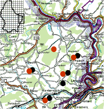 Bereits im Februar (21.2.25) konnten die ersten Rotmilanbeobachtungen gemacht werden (Mompach, Lellig), um die gleiche Zeit wie im Vorjahr. deutlich früher als in den Vorjahren. Es folgten im März die übrigen Revierbesetzungen (Berbourg 22.3.25, Manternach 22.3.25). Schwarzmilanreviervögel wurden am 31.03.25 registriert (Mompach). Die übrigen Revierbesetzungen durch den Schwarzmilan erfolgten in der ersten und zweiten Aprilwoche (5.4.25, 19.4.25) Im Untersuchungsgebiet konnten im Jahr 2025 nur fünf (2024, 2023, 2022 und 2021 waren es 6) Rotmilanreviere- und fünf (2024, 2023 und 2022 waren es auch 5, 2021 waren es sogar 6) Schwarzmilanreviere kartiert werden. Über Anzahl der Bruten und Bruterfolg konnten für 2025 weder bei den Rot- noch bei den Schwarzmilanen Aussagen getroffen werden. Die Horstbäume wurden weder bei den Rotmilanen noch bei den Schwarzmilanen im Jahr 2025 kartiert.