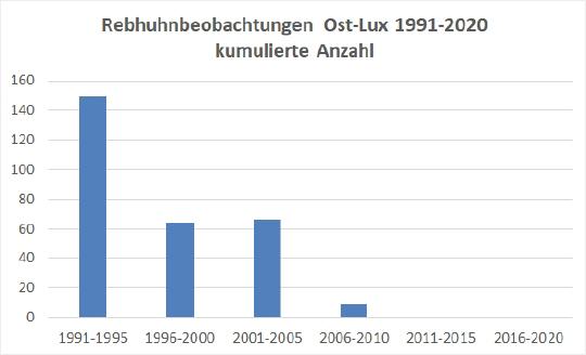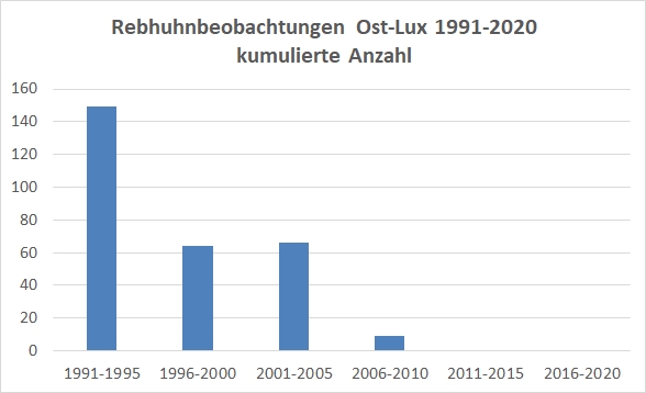 Seit 1991 ist ein kontinuierlicher Rückgang der Rebhuhnbeobachtungen zu verzeichnen. Die letzte Rebhuhnbeobachtung in Ost-Luxemburg (Untersuchungsgebiet) wurde 2006 gemacht. Danach wurden keine regelmäßigen Kontrollen mehr durchgeführt.