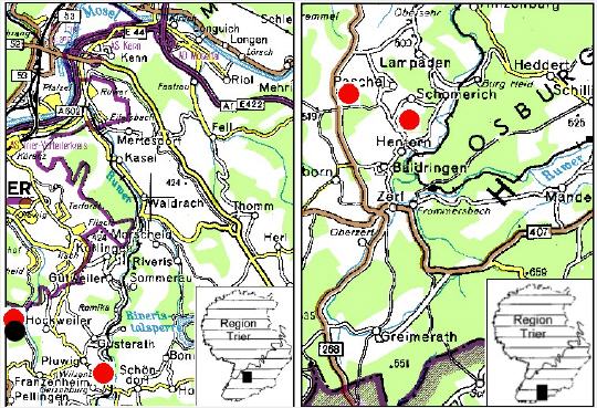 Die Erstbeobachtung erfolgte im Jahr 2012 am 23. Februar (2011 am 25.2.). Die Revierbesetzungen erfolgten durchweg in der ersten Märzhälfte. Im Jahre 2012 konnten (wie im Vorjahr) vier Rotmilanbruten festgestellt werden. Ertsmals seit Jahren konnte auch 2012 wieder eine Schwarzmilanbrut registriert werden. Unter den vier Rotmilanrevieren mit den erfolgreichen Brutpaaren befanden sich die langjährigen Reviere in der Nähe von Schömerich bzw. Pluwig und die zwei erstmals 2010 registrierten Reviere bei Kommlingen und bei Steinbachweiher (Fuchswald). Bei allen Revieren wurden die Vorjahresbrutplätze bezogen. Von den vier Bruten waren drei erfolgreich. Es wurde 2 x 2 und 1 x 1 Jungvogel flügge. Das Rot- und Schwarzmilanrevier bei Longuich blieb auch dieses Jahr unbesetzt. Wahrscheinlich entspricht das durch die Waldarbeiten vor Jahren in Mitleidenschaft gezogene Horstumfeld weiterhin nicht den Ansprüchen an ein Brutrevier. Ein kurzes Intermezzo im Jahr 2008 blieb auch wie bereits 2010 und 2011 auch 2012 ohne Folgen. Gleiches gilt in eingeschränkter Form auch für das vermutete Revier bei Tarforst – Filsch. Allerdings wurde hier 2010, 2011 und 2012 nicht mehr kontrolliert.